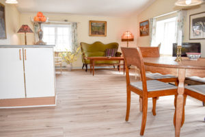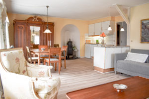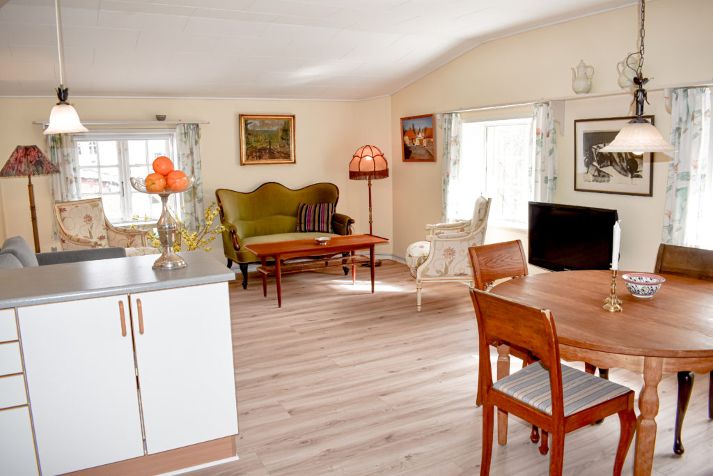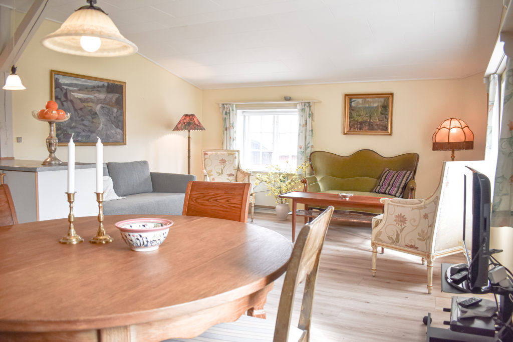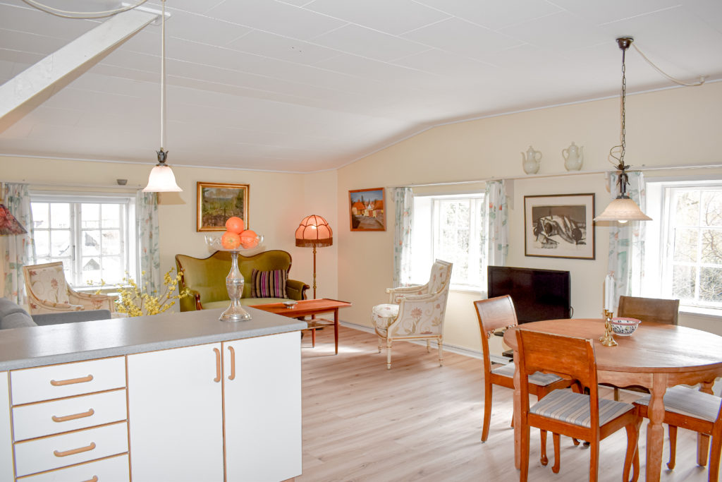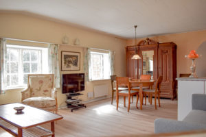 Lejligheden, som er nænsomt restaureret med respekt for stedets historiske atmosfære, indeholder: Veludstyret køkken som ligger åbent til spiseplads og stue. Køkkenet indeholder komfur m.ovn, køleskab med frys, kaffemaskine og elkoger. I stuen er en dobbelt sovesofa, sofagruppe med TV og brændeovn. Der er gratis internet i lejligheden. Soveværelset indeholder to senge. Badeværelse med toilet og bruseniche.