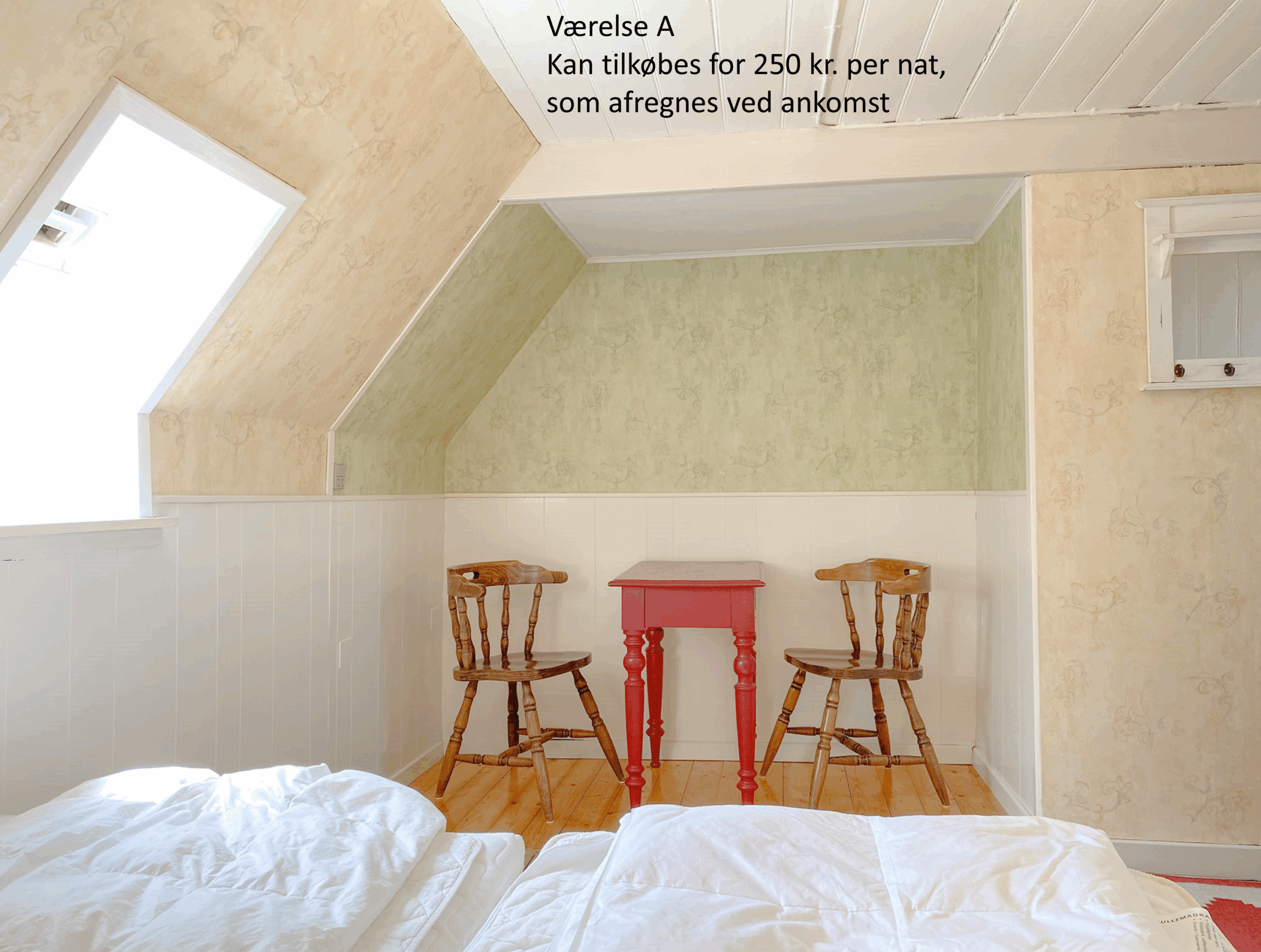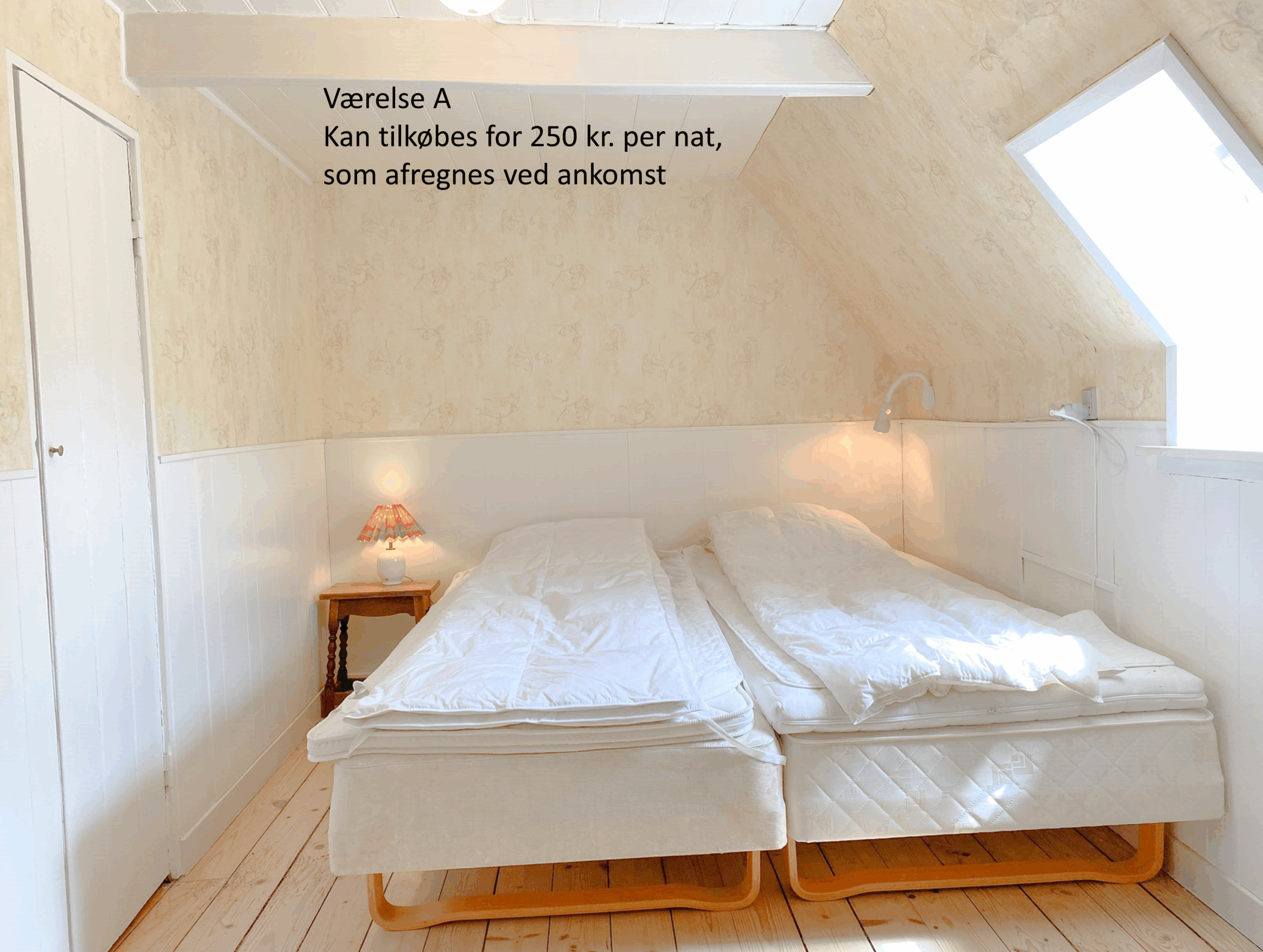 - Værelse A kan tilkøbes for 250 kr. pr. overnatning (afregnes ved ankomst)