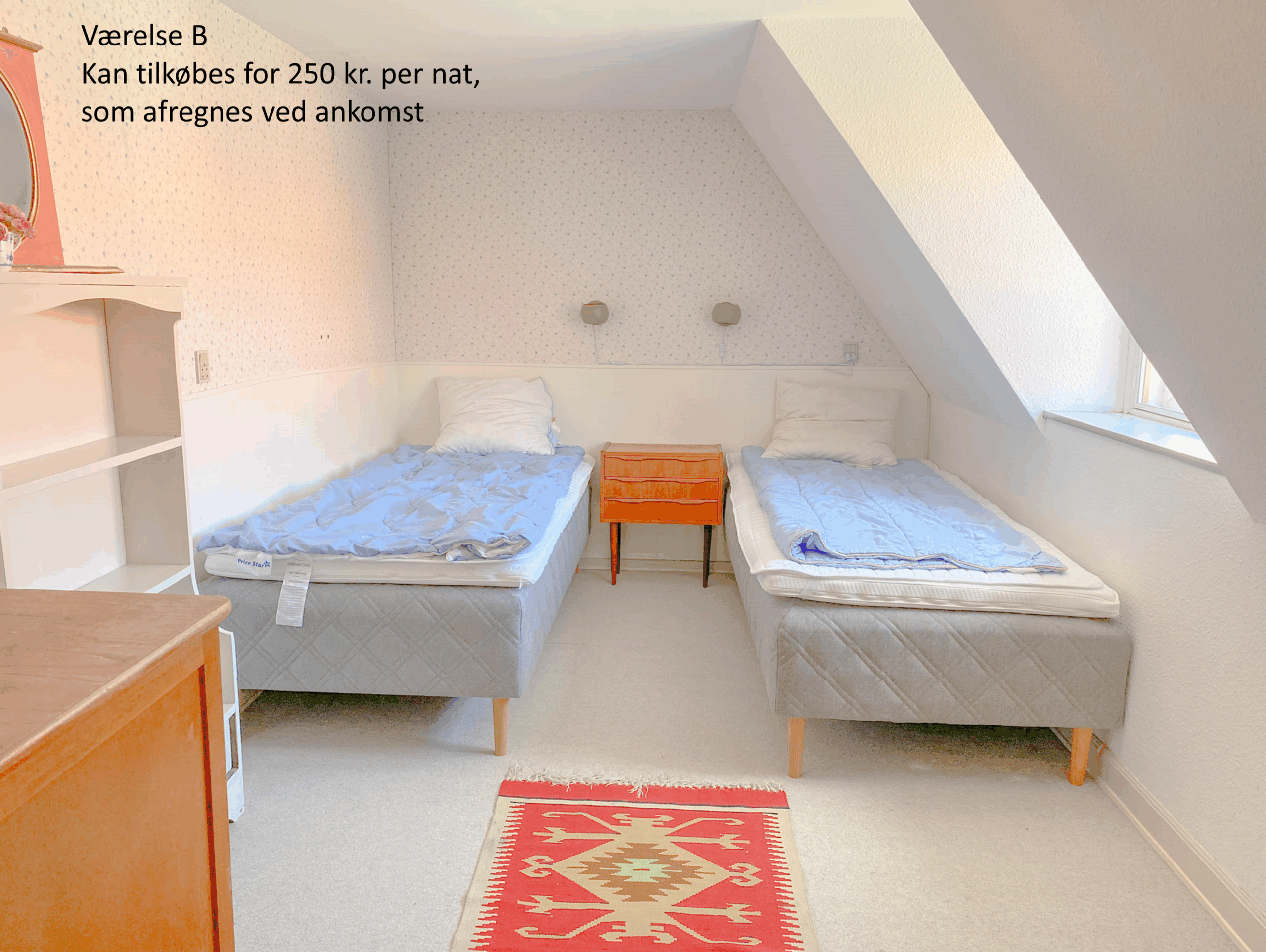 - Værelse B kan tilkøbes for 250 kr pr. overnatning (afregnes ved ankomst)