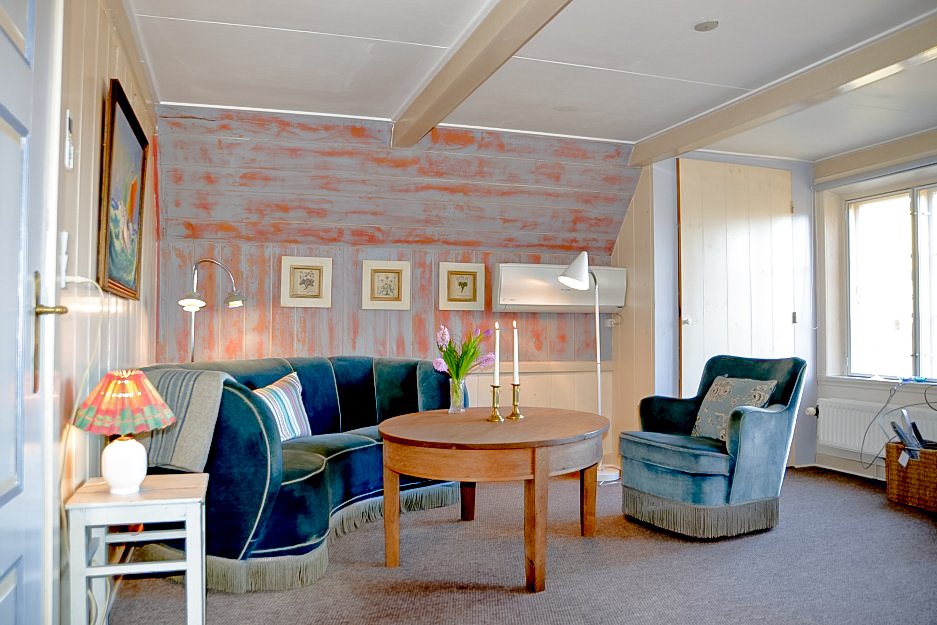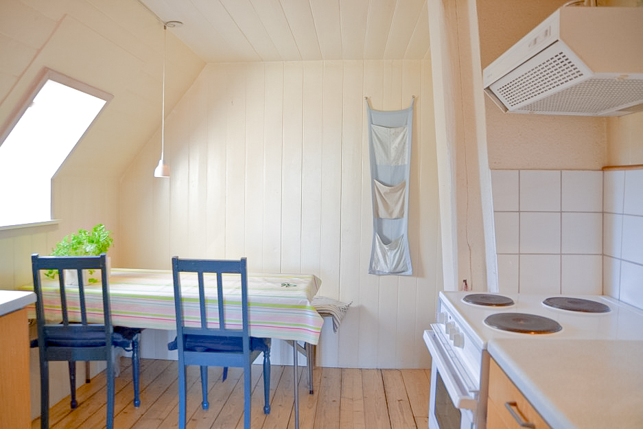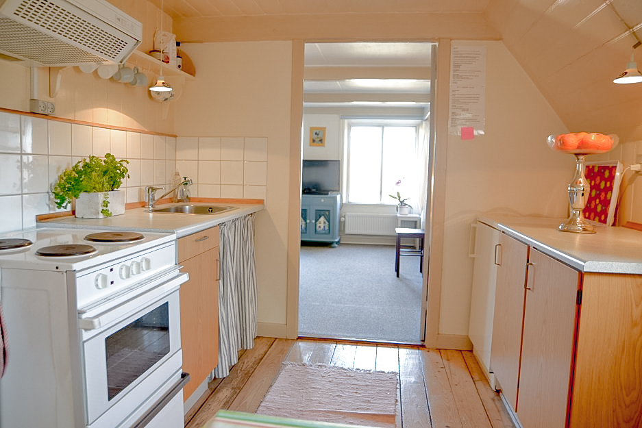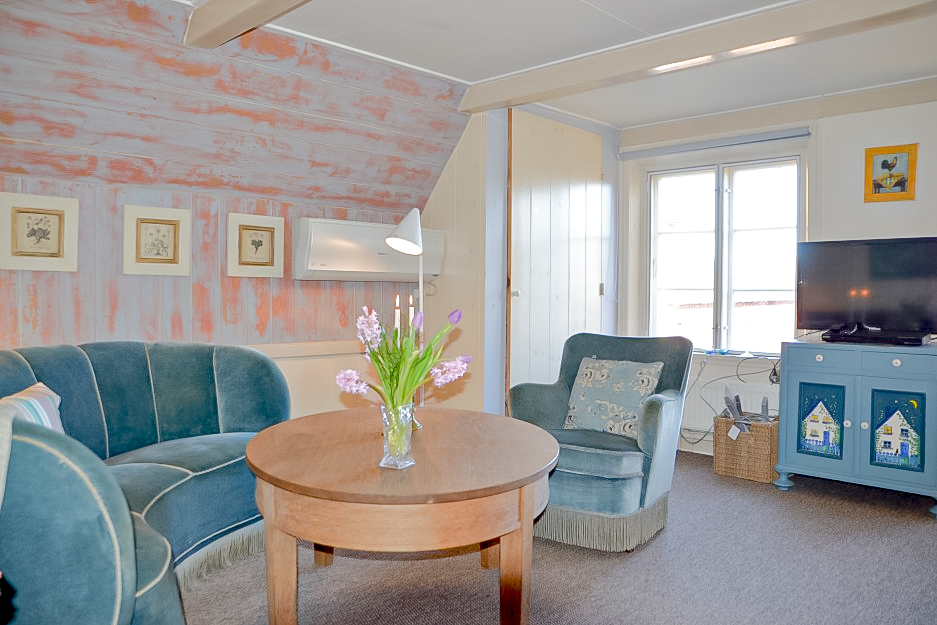 Hyggelig og charmerende lejlighed på første sal beliggende i gårdens søndre længe med fin udsigt over haven og havkig.